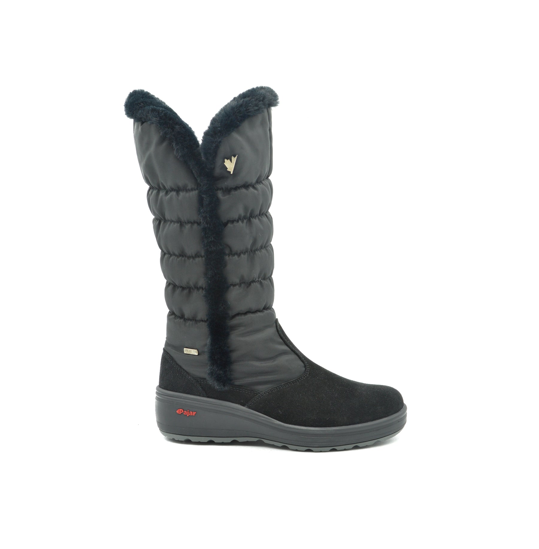 Introducing the luxe 11-inch Sira pull-on alpine boot with inside zip, expertly crafted with quilted nylon and velvet cow suede from Pajar Canada. Fuzzy fleece lining and a padded cushy insole add to the cold-weather comfort of a chic yet utilitarian boot. Features a 2-inch heel and 1-inch platform. The upper is entirely seam-sealed and comfort rated to -30 °C, and -22 °F to keep your feet snug all winter long. The signature Pajar Canada ICE-GRIPPER® thermal rubber traction lug sole will get you through icy streets in style keeping you surefooted all the while. Our premium removable comfort molded insole features a cushy wool blend that is both breathable and anti-microbial. The waterproof leather upper has been pre-treated to repel water and stains