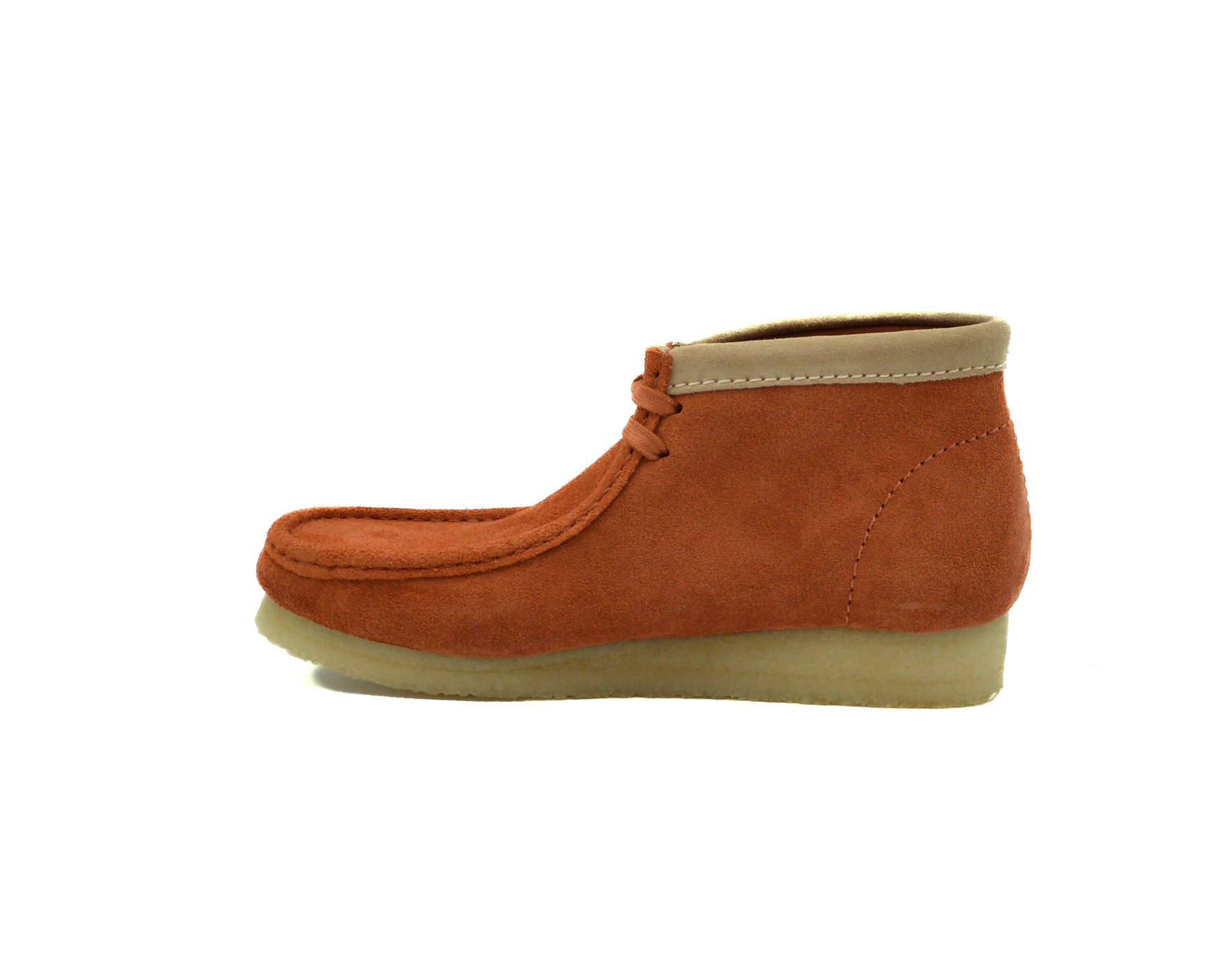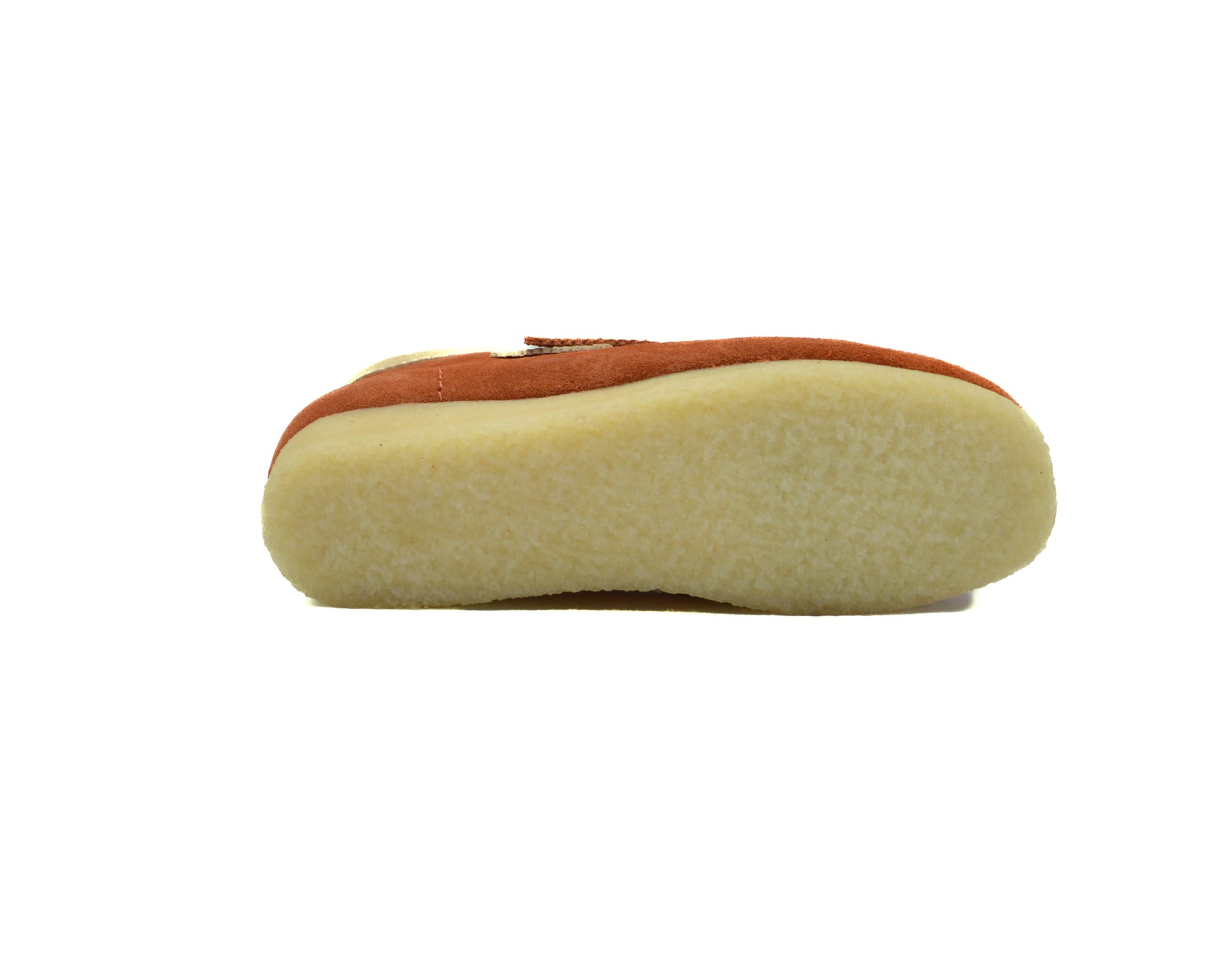 An iconic look for summer, a dark tan colorway creates a classic iteration of our heritage Wallabee Boot. With premium suede uppers for a crafted feel, its chunky pebble crepe sole stays true to its design DNA, while waxy laces and fobs add style appeal. Premium dark tan suede upper Natural rubber pebble crepe sole Finished with two Clarks Originals fobs.