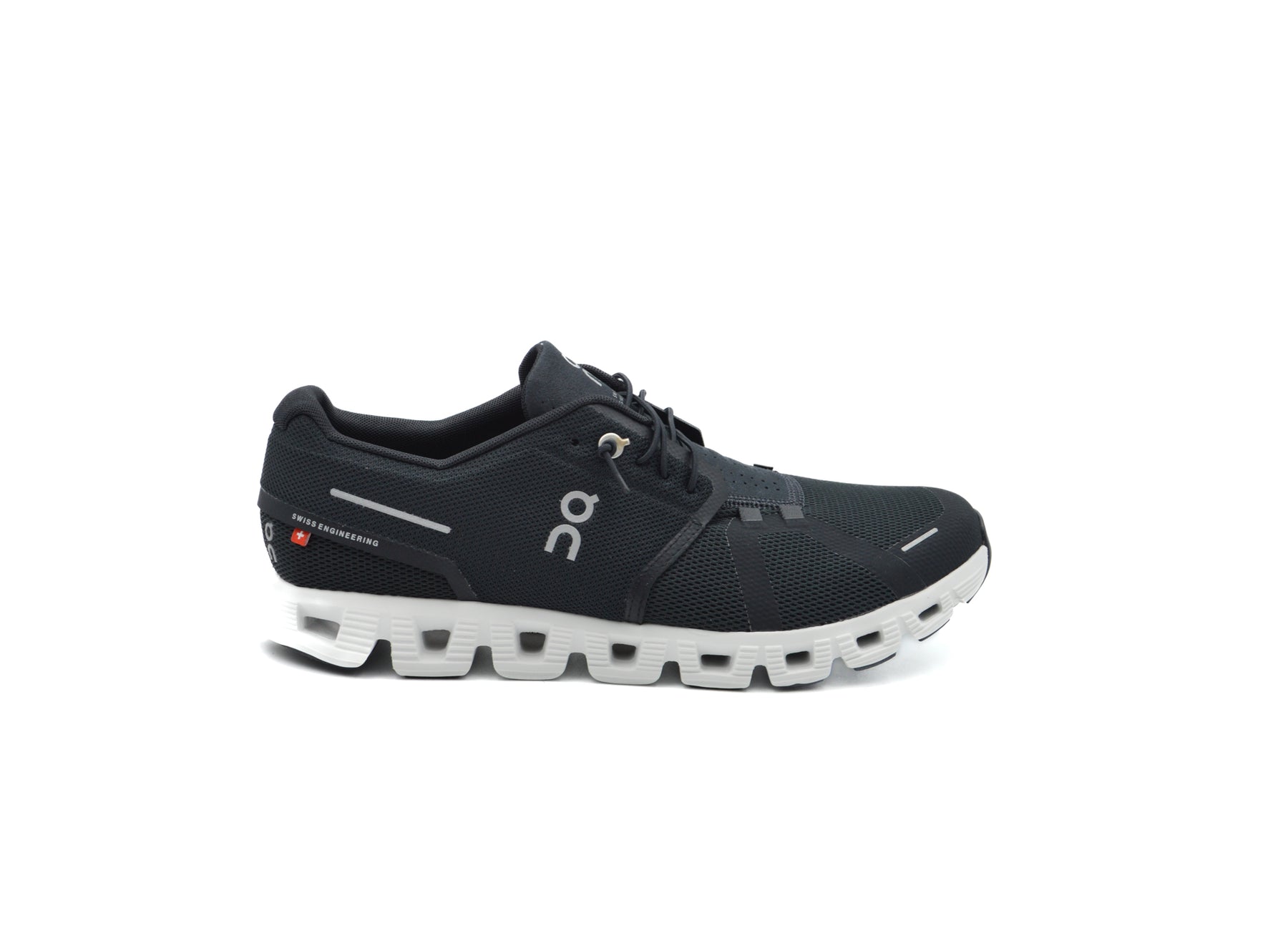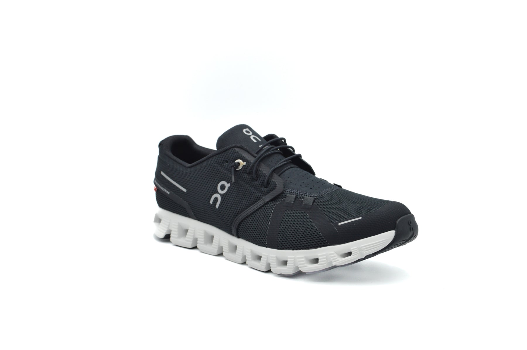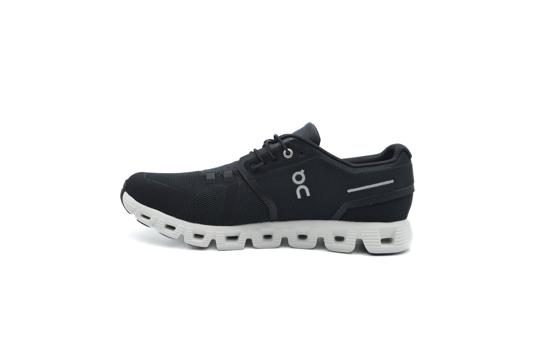 Black/white fabric/rubber Cloud 5 running sneakers from On Running featuring mesh panelling, logo print to the side, logo-print tongue, round toe, ridged rubber sole and perforated tongue.