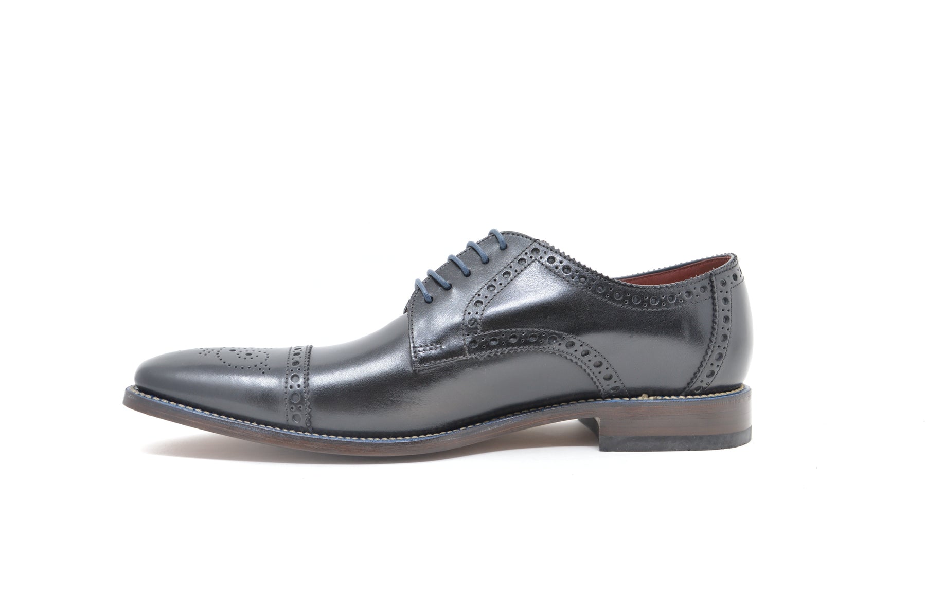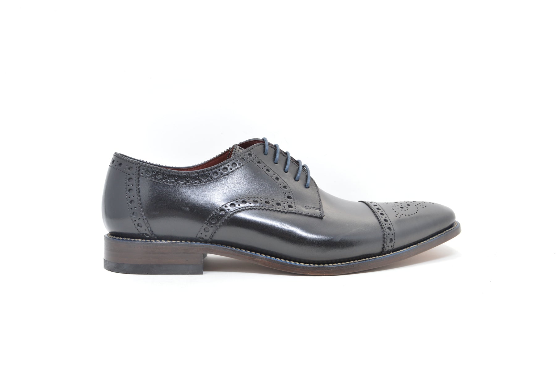 Stylish Semi Brogue derby shoe, made using the ‘Ridge’ last shape. Foley is available in tan or black calf leathers, and features a contrast blue welt. Foley is handcrafted in India.
