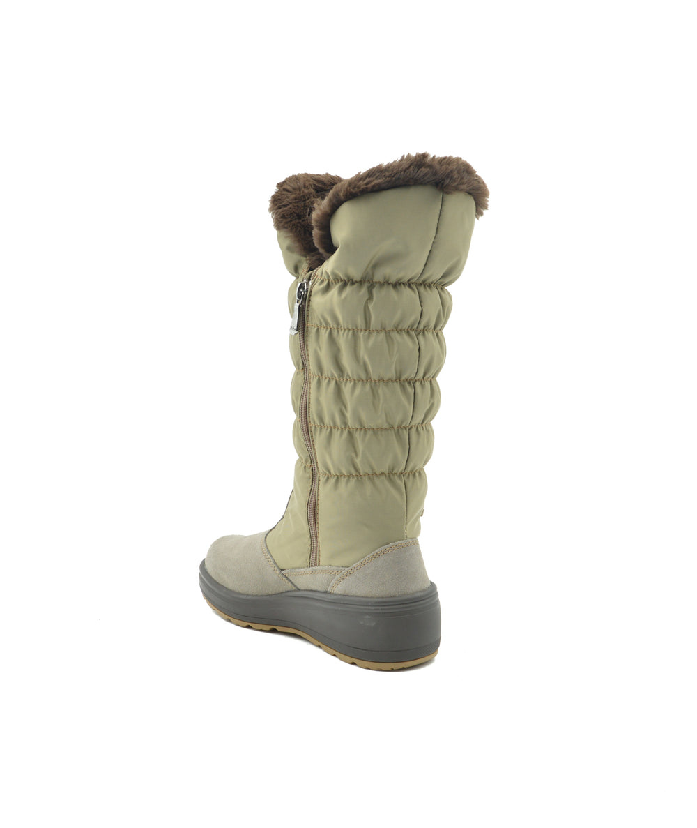 Introducing the luxe 11-inch Sira pull-on alpine boot with inside zip, expertly crafted with quilted nylon and velvet cow suede from Pajar Canada. Fuzzy fleece lining and a padded cushy insole add to the cold-weather comfort of a chic yet utilitarian boot. Features a 2-inch heel and 1-inch platform. The upper is entirely seam-sealed and comfort rated to -30 °C, and -22 °F to keep your feet snug all winter long. The signature Pajar Canada ICE-GRIPPER® thermal rubber traction lug sole will get you through icy streets in style keeping you surefooted all the while. Our premium removable comfort molded insole features a cushy wool blend that is both breathable and anti-microbial. The waterproof leather upper has been pre-treated to repel water and stains