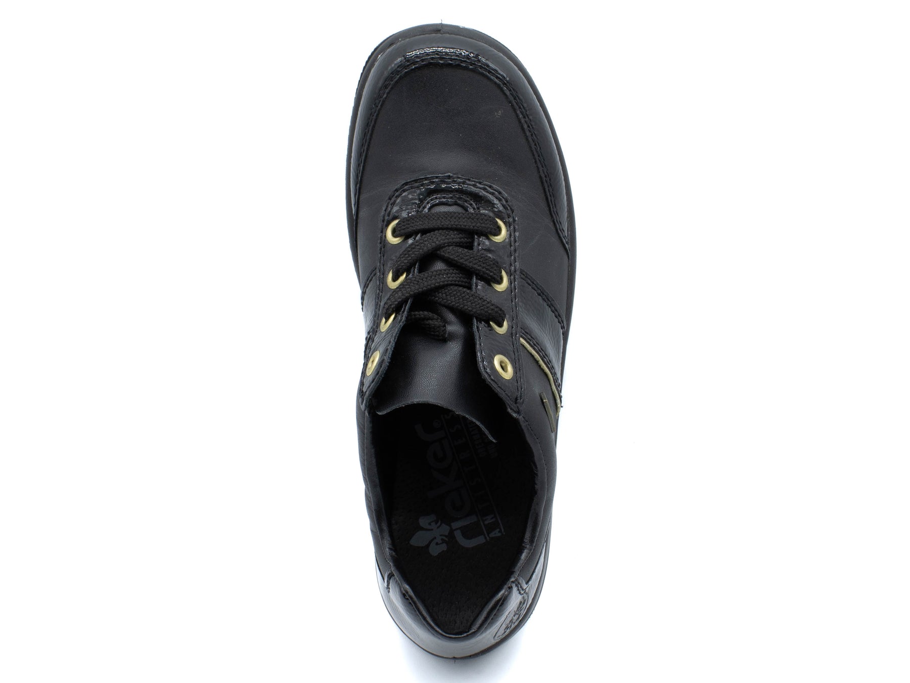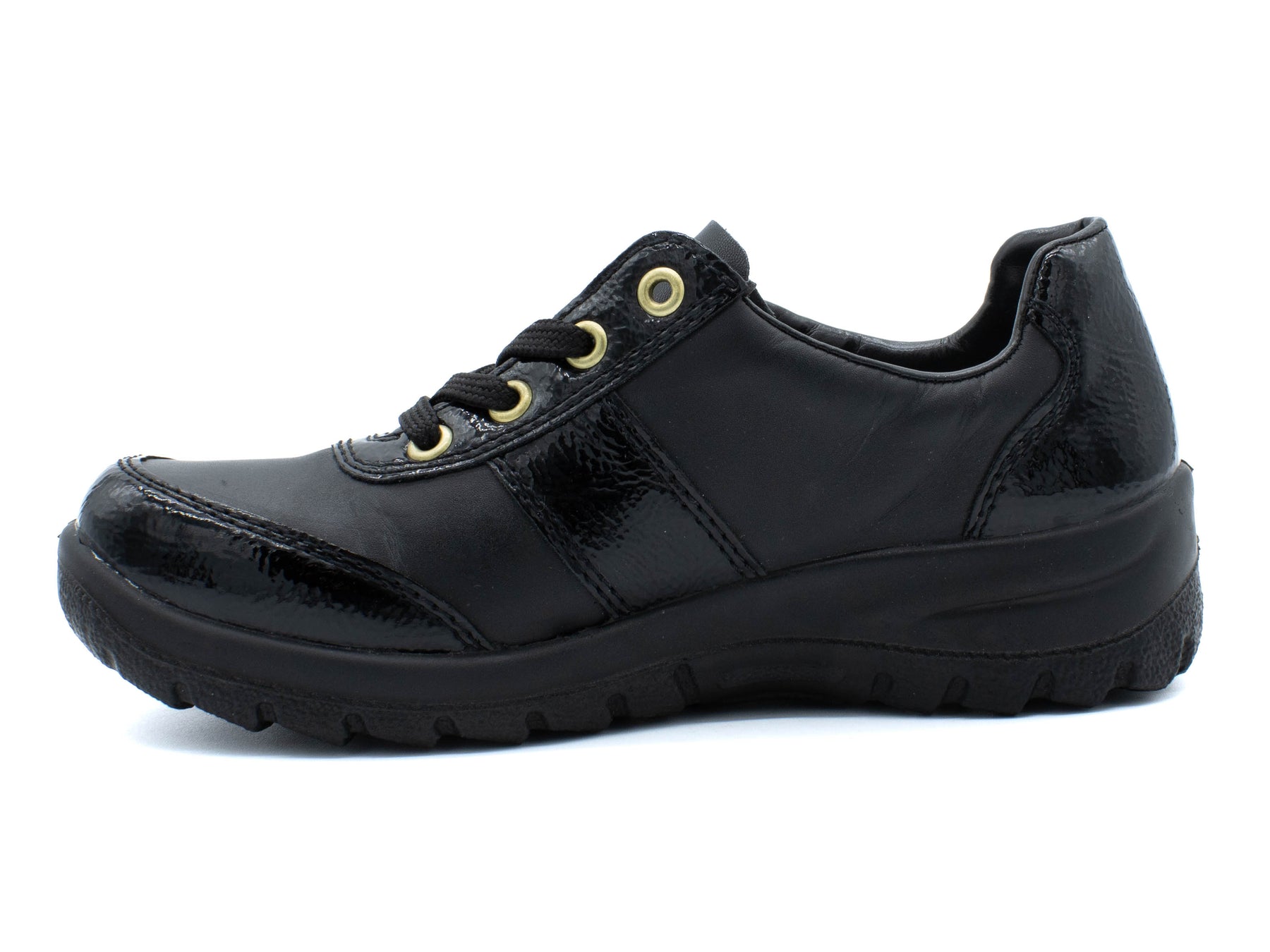 L7120-00 is a handy trainer style lace-up from Rieker that uses a combination of synthetic and real leathers in the upper, the patent touches and gold details giving L7120-00 a smarter look. Treated to Rieker-Tex, this is a water-resistant style. L7120-00 has a chunky PU sole that offers a hard-wearing base with both flexibility and shock-absorption.