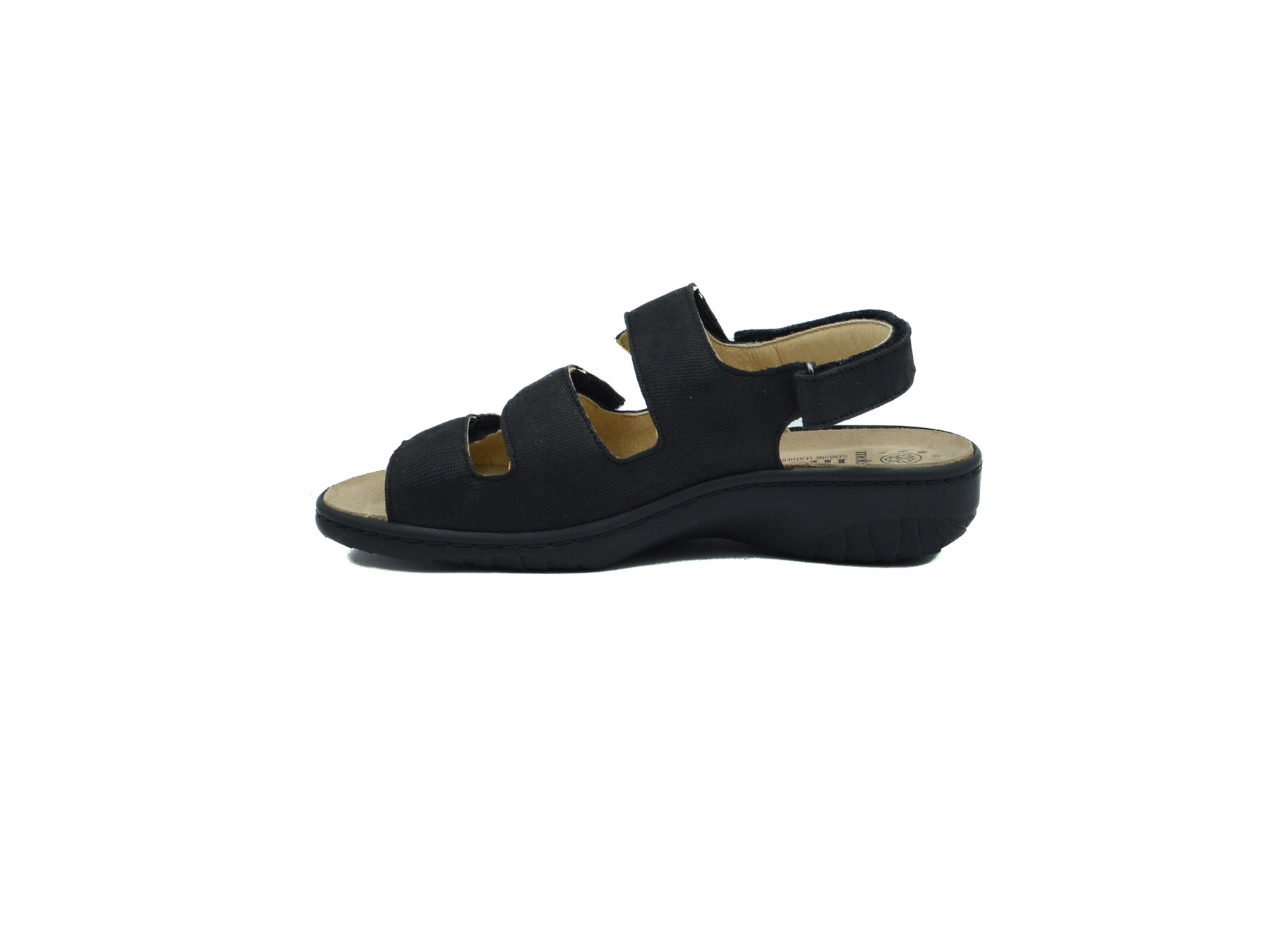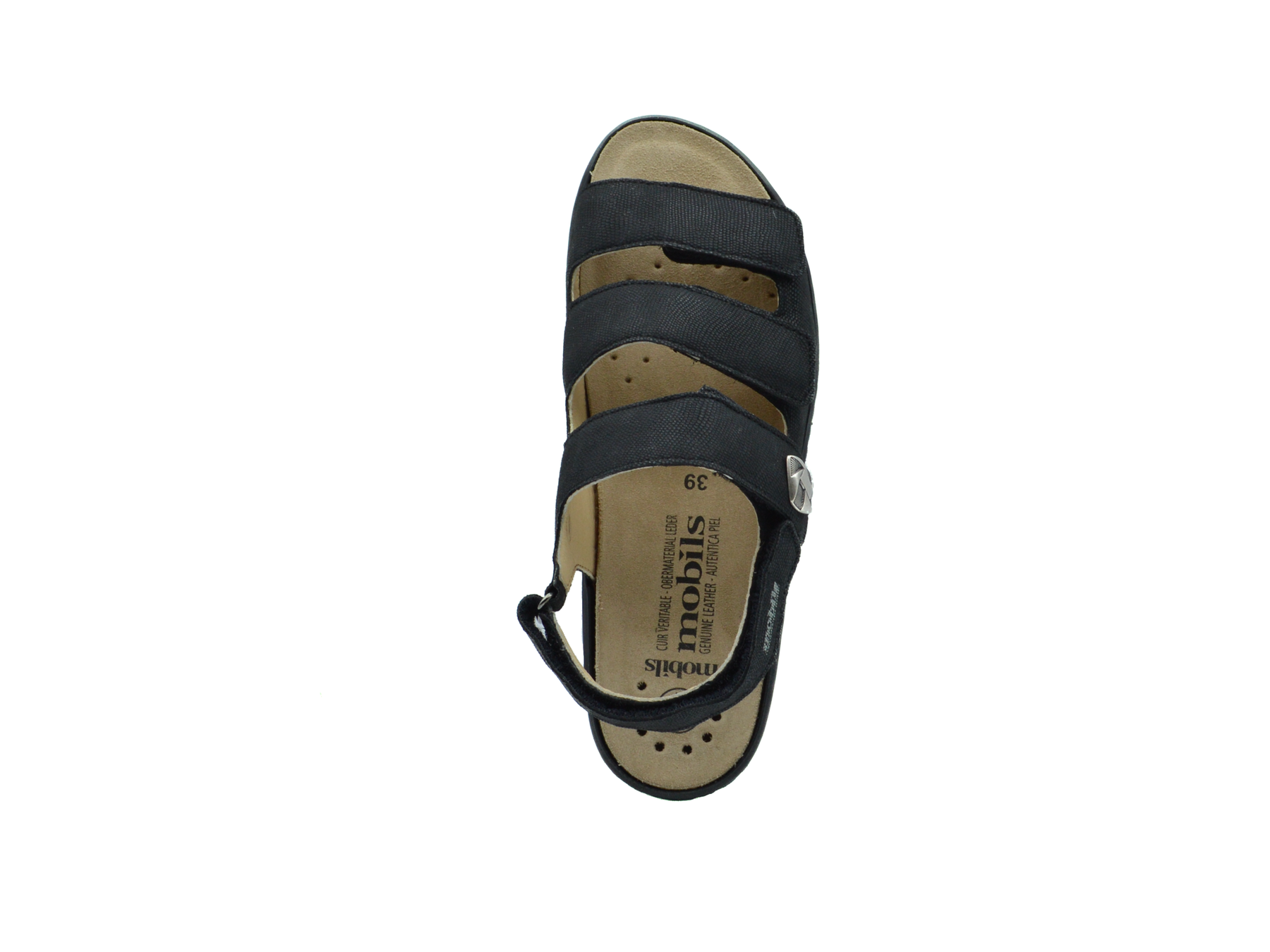 Easy to slip on and very comfortable, this sandal will satisfy all your daily needs. The SHOCK-ABSORBER, in the outsole, and the detachable insole, with integrated SOFT-AIR Technology, help to minimise impact for a gentle, effortless walk. Its INTEGRAL CUSHIONING ensures an exceptional fit. This sandal with adhesive band straps is embellished with a small ornament on the strap. Its real leather lining guarantees superior quality and comfort.