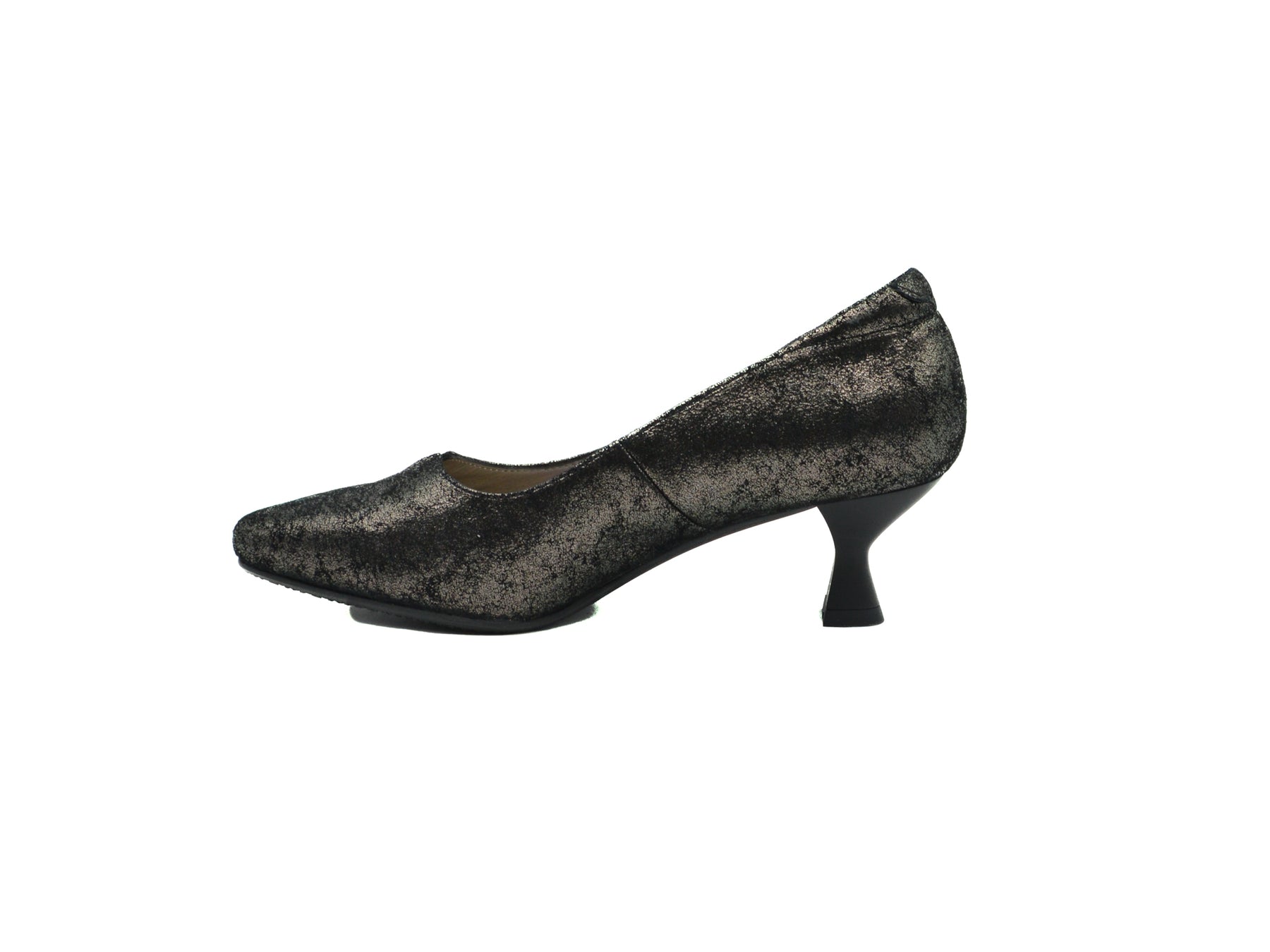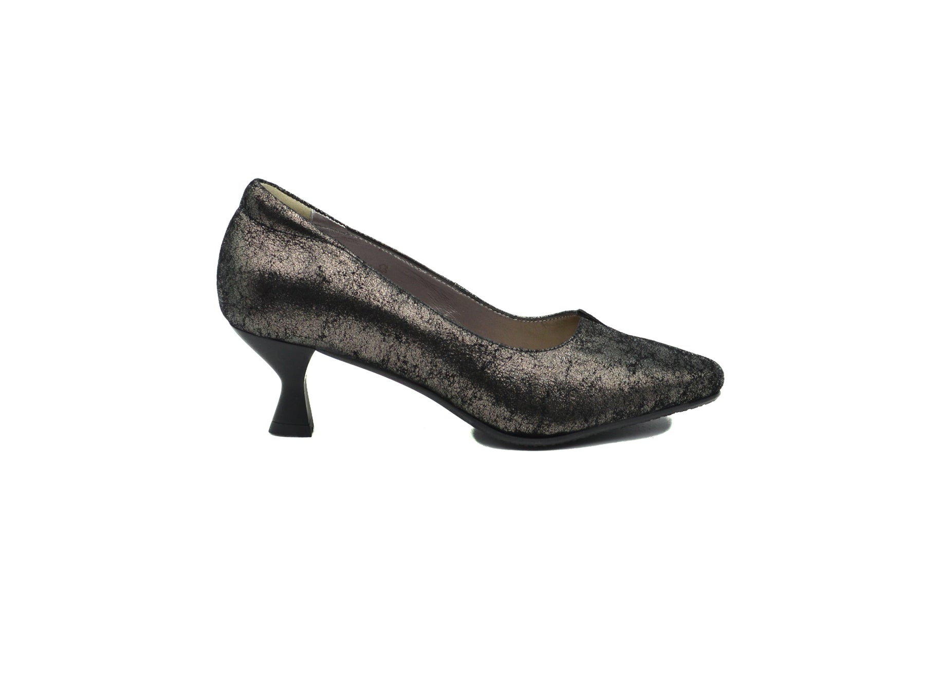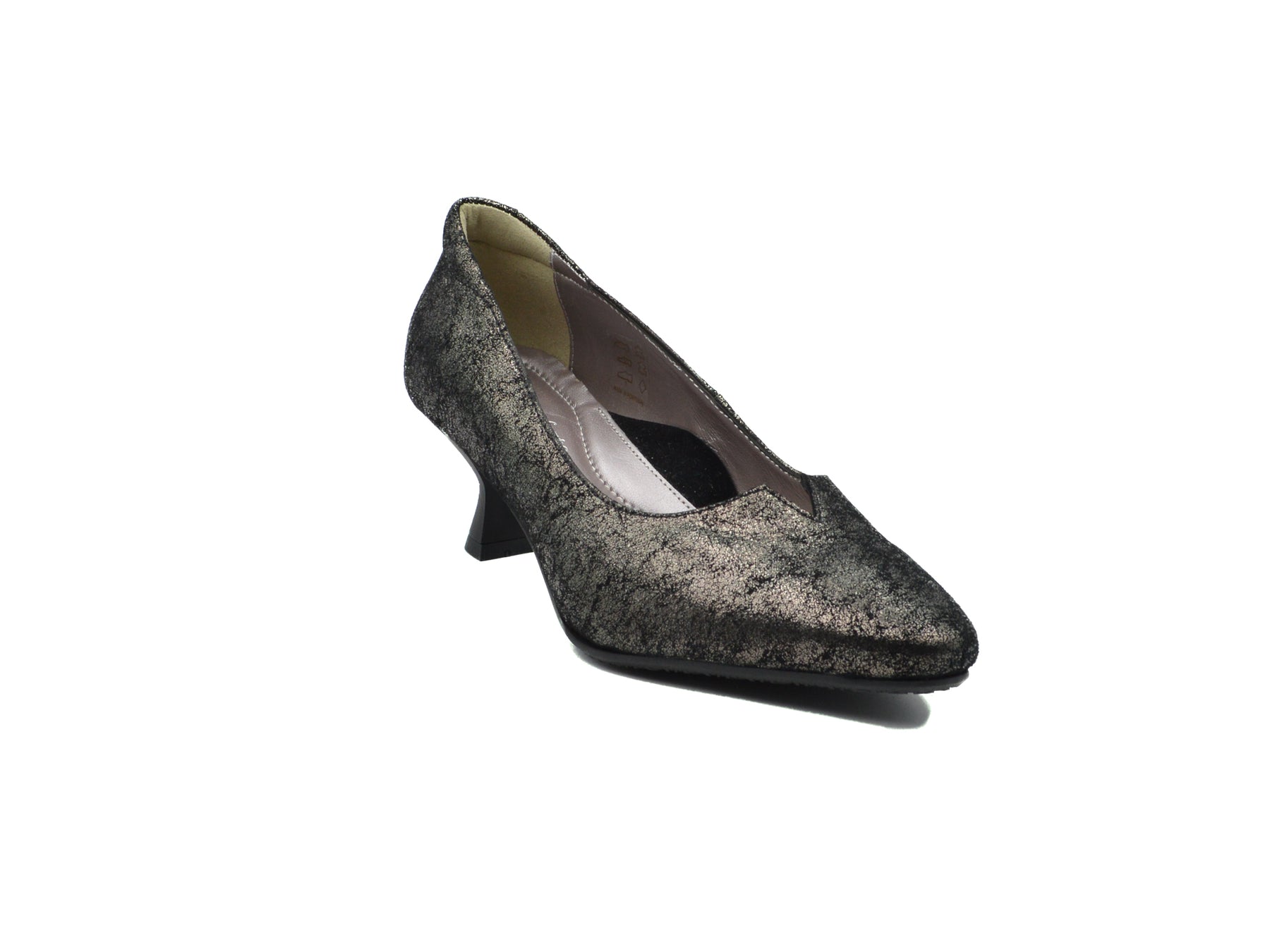 Split toe pump. Leather linings and leather covered latex padded footbed. Rubber sole. 2 inch hourglass heel. Made in Portugal.