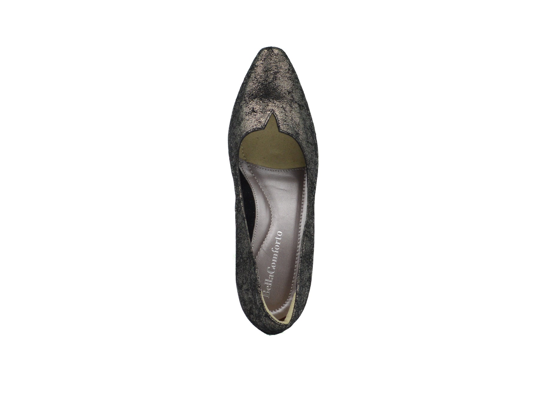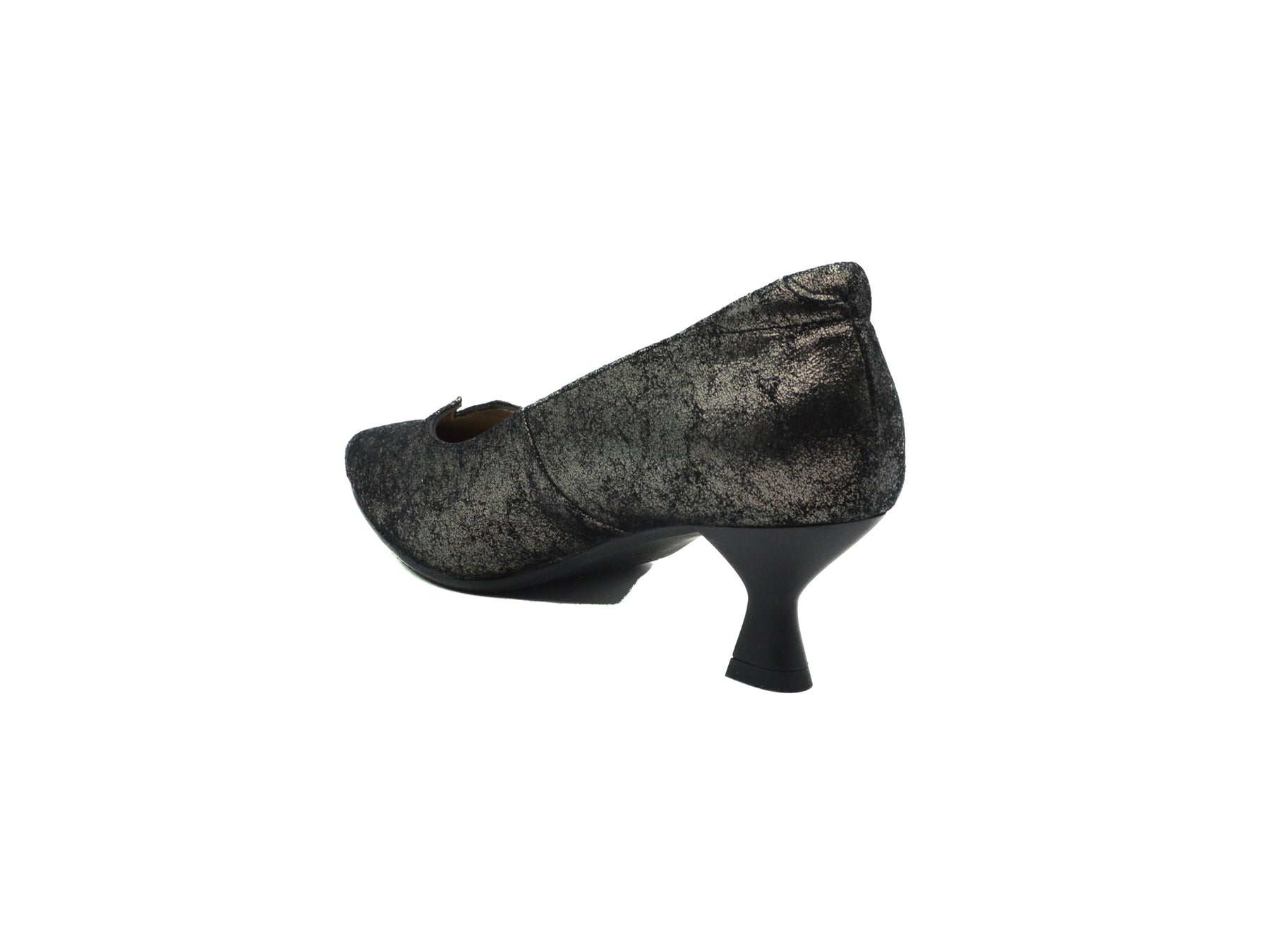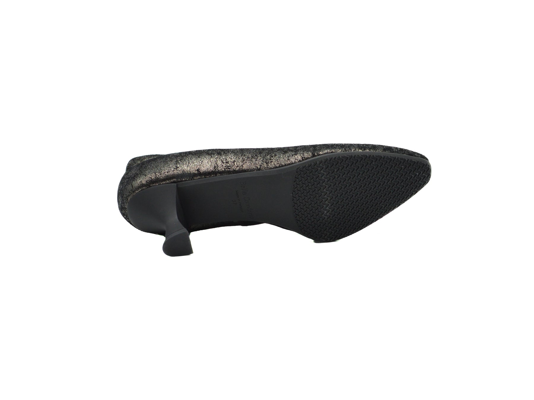 Split toe pump. Leather linings and leather covered latex padded footbed. Rubber sole. 2 inch hourglass heel. Made in Portugal.