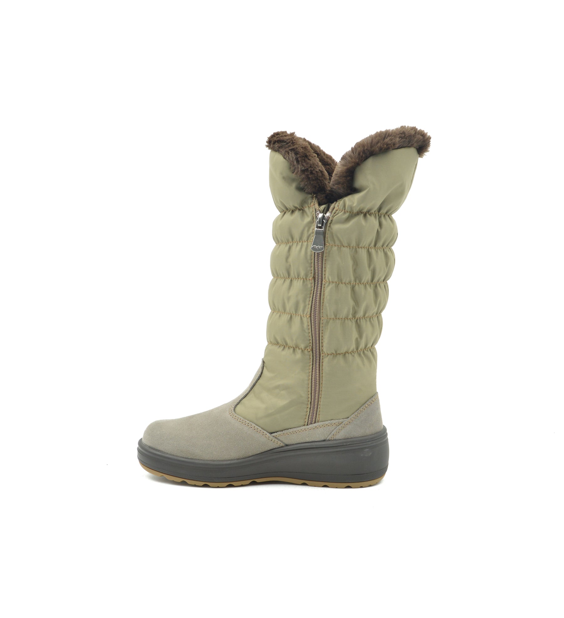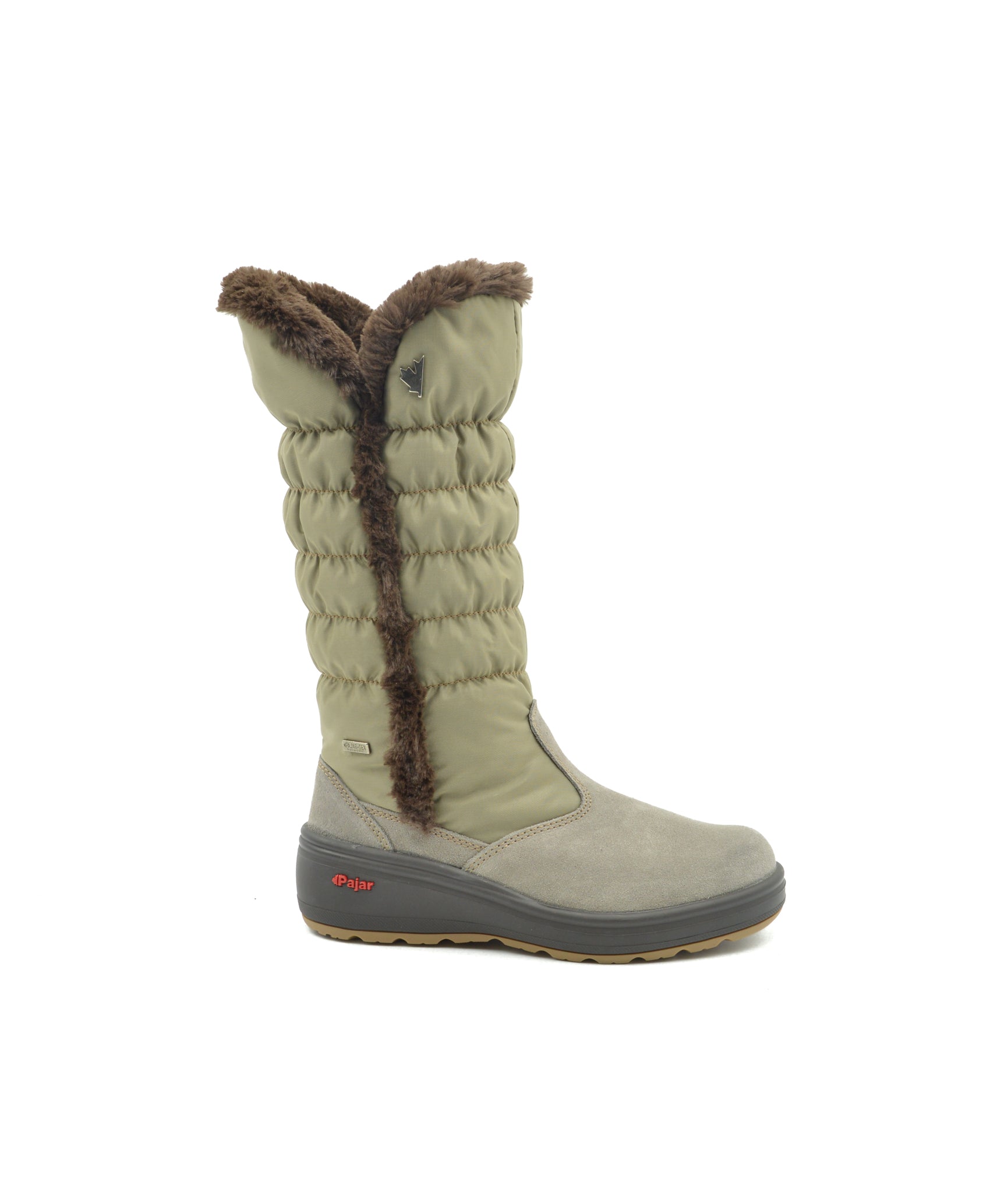 Introducing the luxe 11-inch Sira pull-on alpine boot with inside zip, expertly crafted with quilted nylon and velvet cow suede from Pajar Canada. Fuzzy fleece lining and a padded cushy insole add to the cold-weather comfort of a chic yet utilitarian boot. Features a 2-inch heel and 1-inch platform. The upper is entirely seam-sealed and comfort rated to -30 °C, and -22 °F to keep your feet snug all winter long. The signature Pajar Canada ICE-GRIPPER® thermal rubber traction lug sole will get you through icy streets in style keeping you surefooted all the while. Our premium removable comfort molded insole features a cushy wool blend that is both breathable and anti-microbial. The waterproof leather upper has been pre-treated to repel water and stains