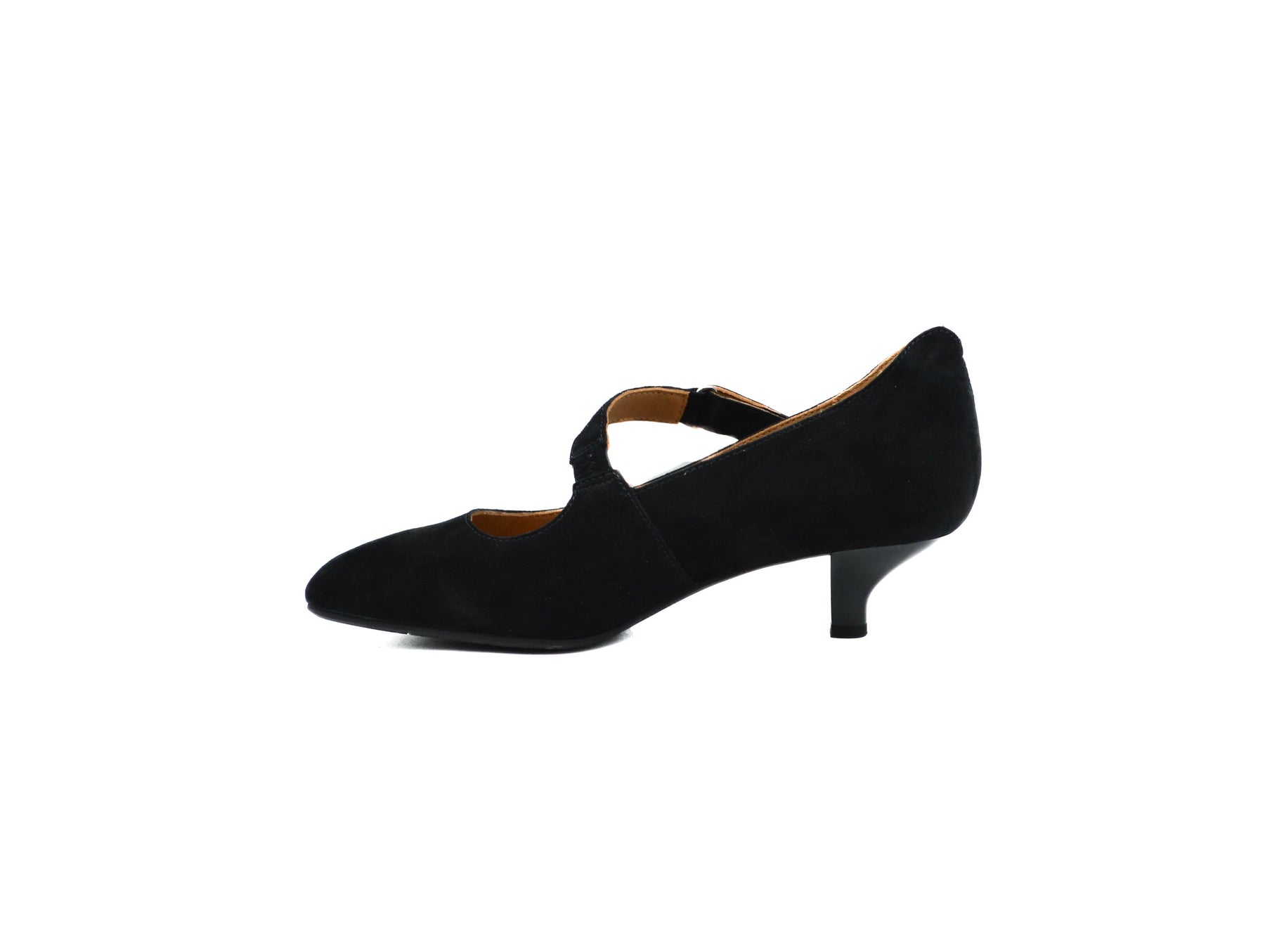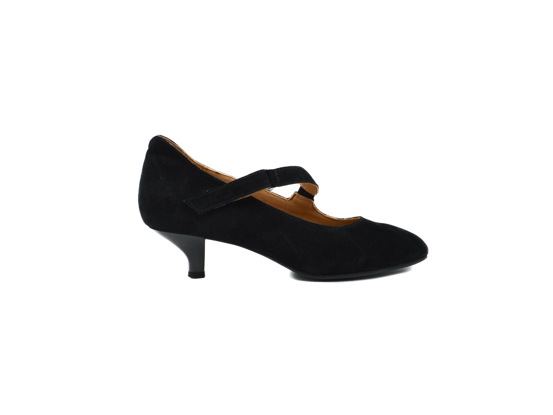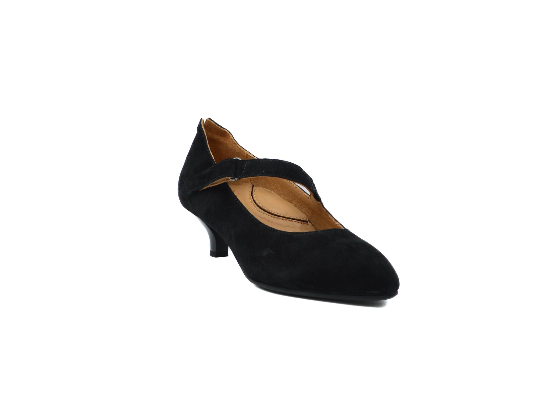 This leather pump has an almond toe, memory foam insole, leather lining and synthetic outsole. This style also features a hook and loop closure on a 1.5 inch heel.